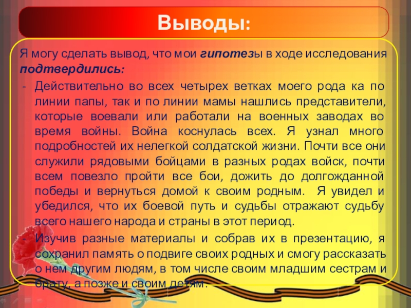 Изучив разные материалы и собрав их в презентацию, я сохранил память о подвиге своих родных и смогу рассказать о нем другим людям, в том числе своим младшим сестрам и брату, а позже и своим детям.
