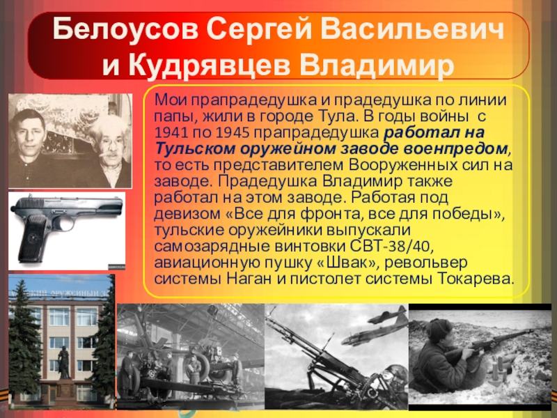 папы, жили в городе Тула. В годы войны с 1941 по 1945 прапрадедушка работал на Тульском оружейном заводе военпредом, то есть представителем Вооруженных сил на заводе. Прадедушка Владимир также работал на этом заводе. Работая под девизом «Все для фронта, все для победы», тульские оружейники выпускали самозарядные винтовки СВТ-38/40, авиационную пушку «Швак», револьвер системы Наган и пистолет системы Токарева.
