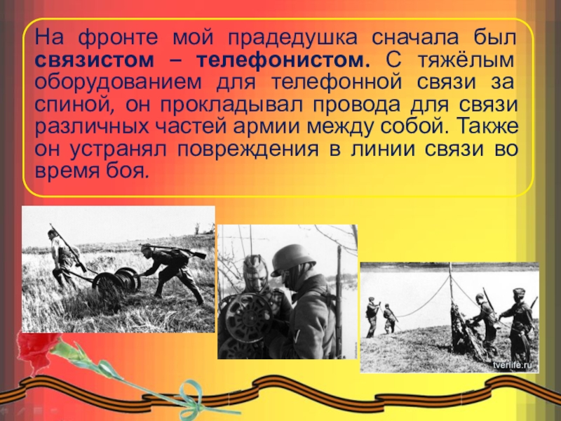 Слайд 9На фронте мой прадедушка сначала был связистом – телефонистом. С тяжёлым