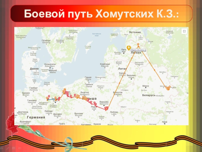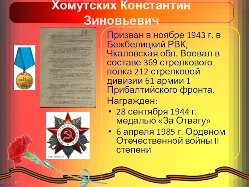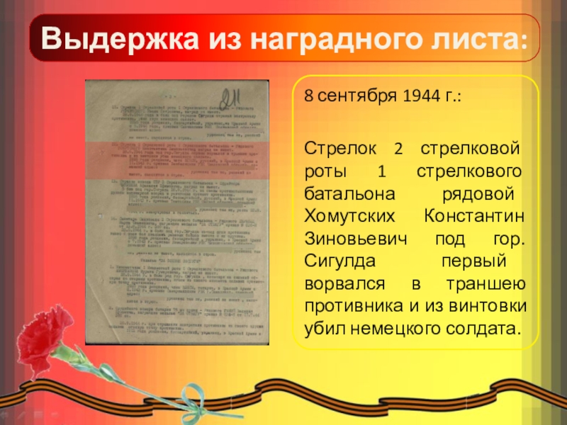 стрелкового батальона рядовой Хомутских Константин Зиновьевич под гор. Сигулда первый ворвался в траншею противника и из винтовки убил немецкого солдата.