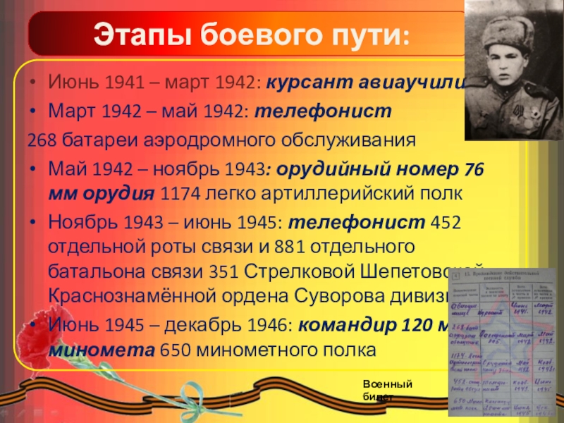 Июнь 1945 – декабрь 1946: командир 120 мм миномета 650 минометного полка