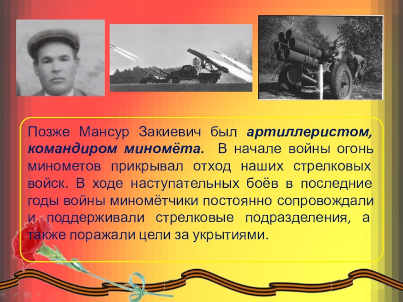 Слайд 10Позже Мансур Закиевич был артиллеристом, командиром миномёта. В начале войны огонь