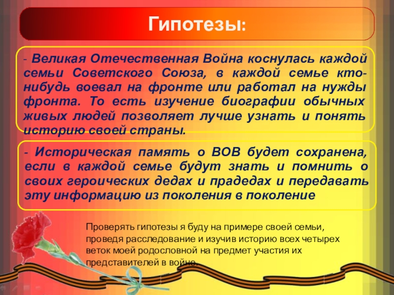Проверять гипотезы я буду на примере своей семьи, проведя расследование и изучив историю всех четырех веток моей родословной на предмет участия их представителей в войне.