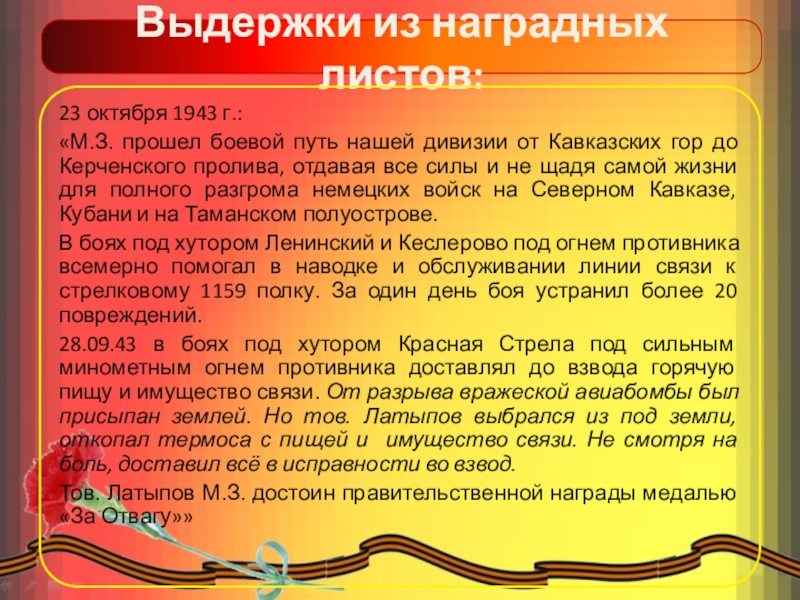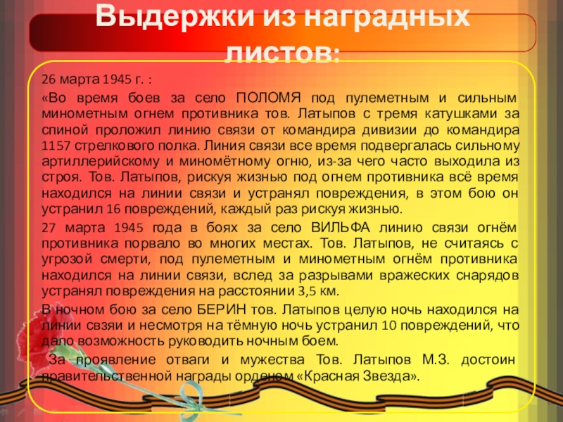 За проявление отваги и мужества Тов. Латыпов М.З. достоин правительственной награды орденом «Красная Звезда».