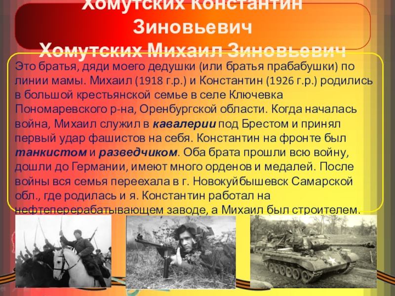 прабабушки) по линии мамы. Михаил (1918 г.р.) и Константин (1926 г.р.) родились в большой крестьянской семье в селе Ключевка Пономаревского р-на, Оренбургской области. Когда началась война, Михаил служил в кавалерии под Брестом и принял первый удар фашистов на себя. Константин на фронте был танкистом и разведчиком. Оба брата прошли всю войну, дошли до Германии, имеют много орденов и медалей. После войны вся семья переехала в г. Новокуйбышевск Самарской обл., где родилась и я. Константин работал на нефтеперерабатывающем заводе, а Михаил был строителем.