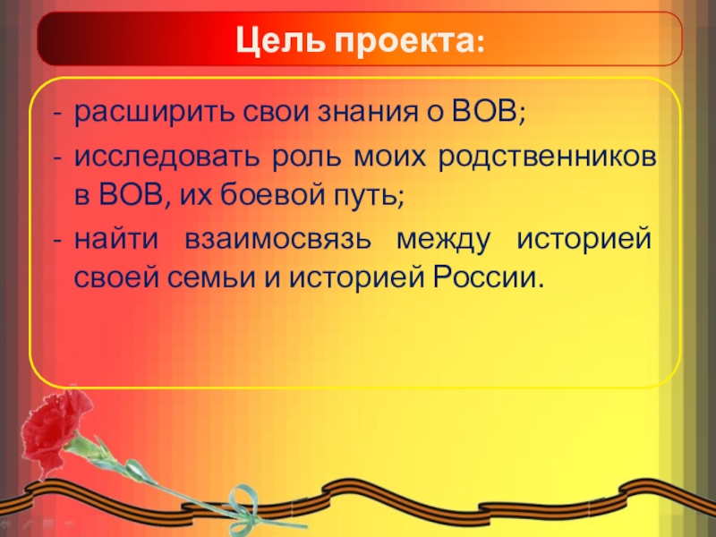 - Великая Отечественная Война коснулась каждой семьи Советского Союза, в каждой семье кто-нибудь воевал на фронте или работал на нужды фронта. То есть изучение биографии обычных живых людей позволяет лучше узнать и понять историю своей страны.