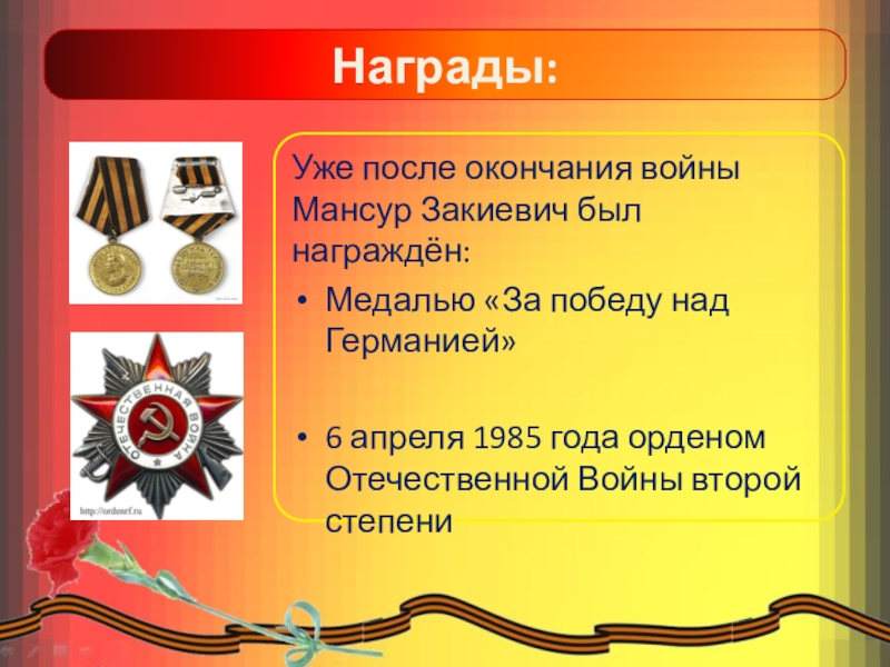 6 апреля 1985 г. Орденом Отечественной войны II степени