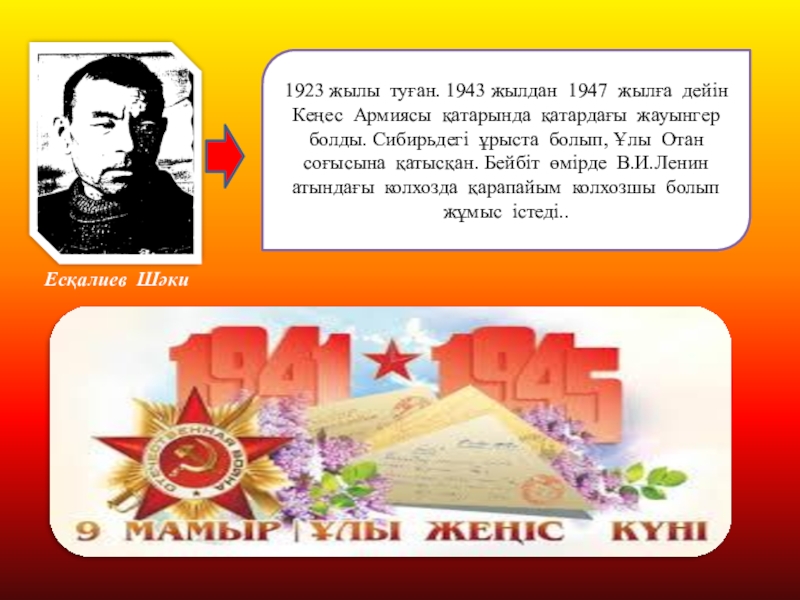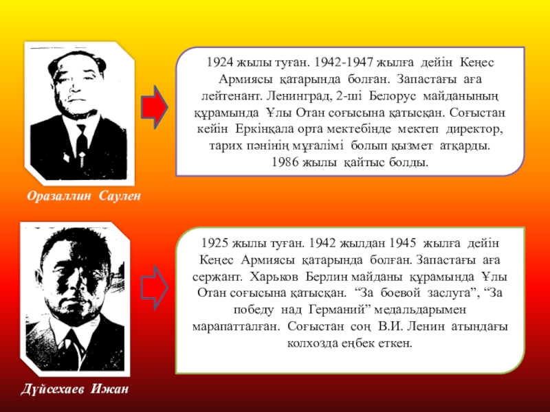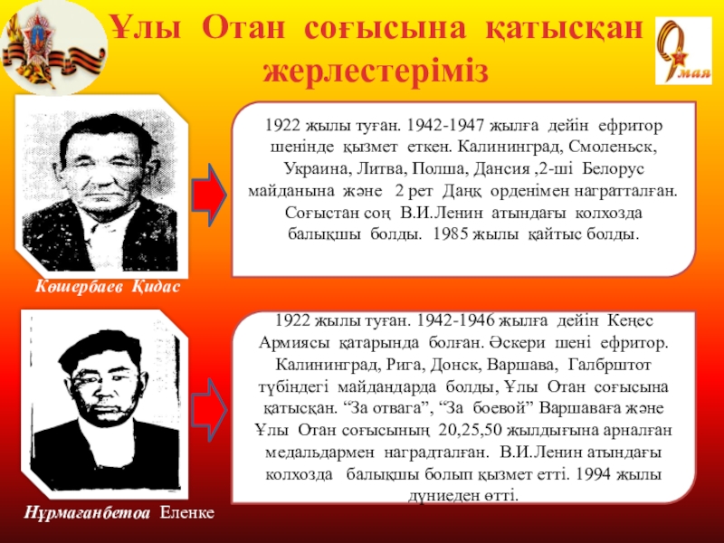 1925 жылы туған. 1942 жылдан 1945 жылға дейін Кеңес Армиясы қатарында болған. Запастағы аға сержант. Харьков Берлин майданы құрамында Ұлы Отан соғысына қатысқан. “За боевой заслуга”, “За победу над Германий” медальдарымен марапатталған. Соғыстан соң В.И. Ленин атындағы колхозда еңбек еткен.