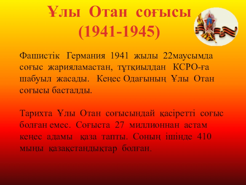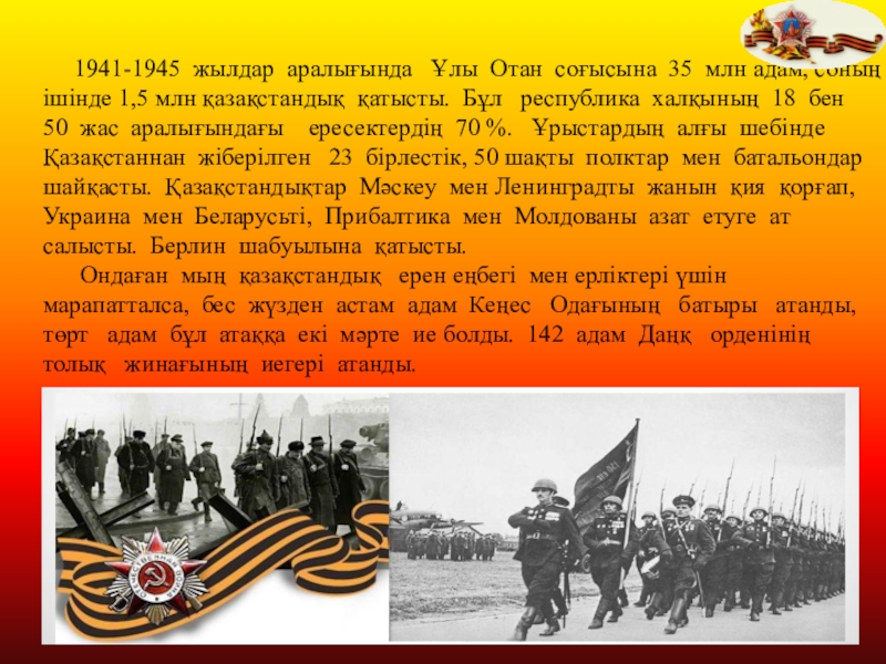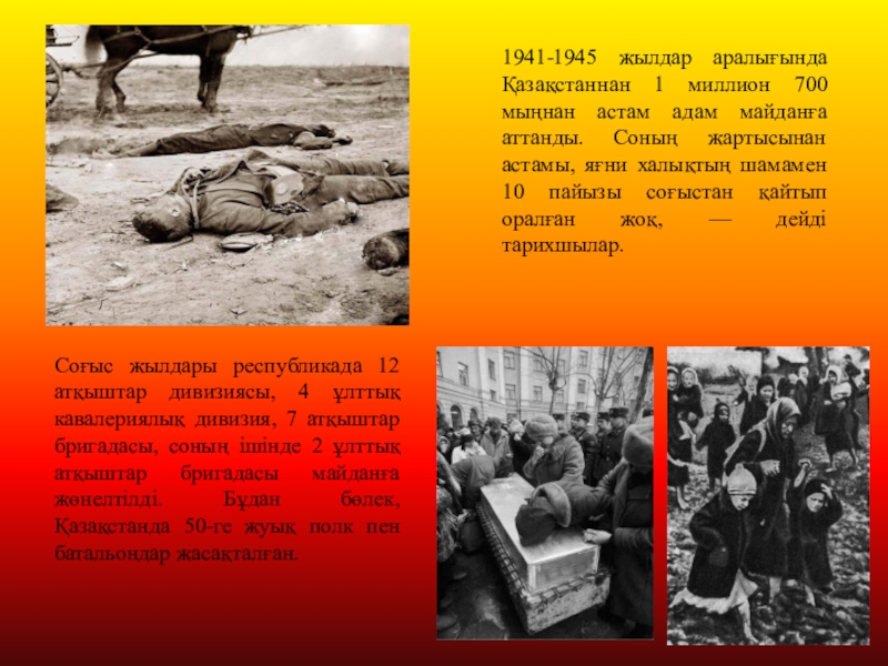Соғыс жылдары республикада 12 атқыштар дивизиясы, 4 ұлттық кавалериялық дивизия, 7 атқыштар бригадасы, соның ішінде 2 ұлттық атқыштар бригадасы майданға жөнелтілді. Бұдан бөлек, Қазақстанда 50-ге жуық полк пен батальондар жасақталған.