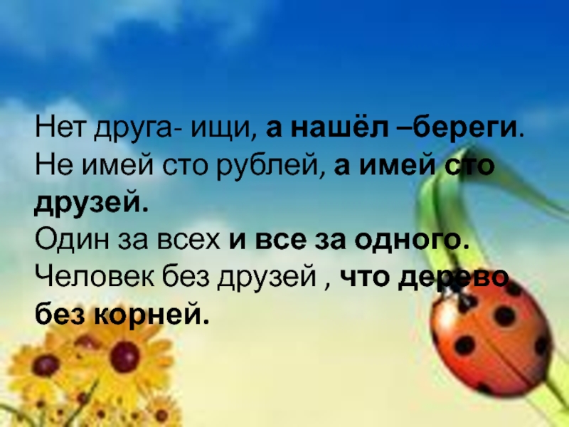 Слайд 6 Нет друга- ищи, а нашёл –береги. Не имей сто рублей, а имей