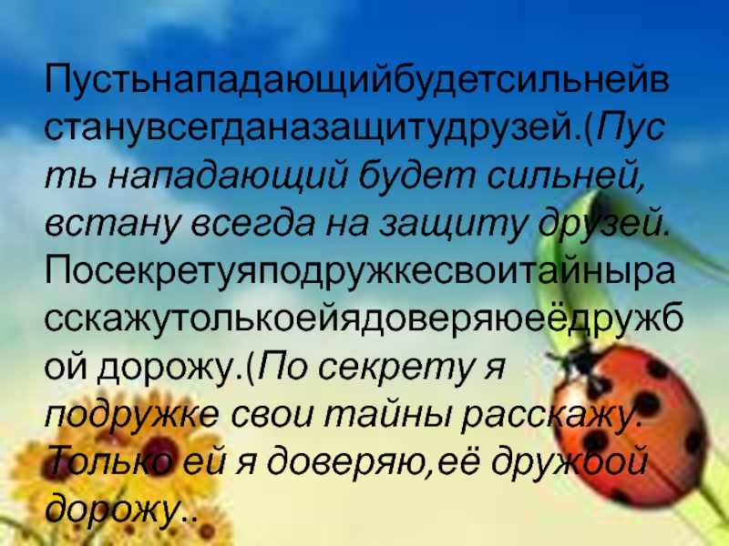 Пустьнападающийбудетсильнейвстанувсегданазащитудрузей.(Пусть нападающий будет сильней, встану всегда на защиту друзей. Посекретуяподружкесвоитайнырасскажутолькоейядоверяюеёдружбой дорожу.(По секрету я подружке свои