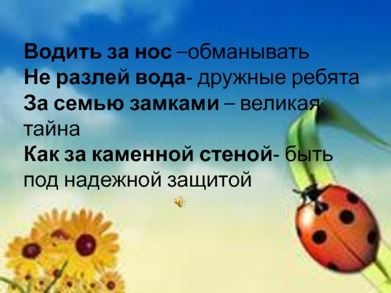 Водить за нос –обманывать  Не разлей вода- дружные ребята За семью замками – великая