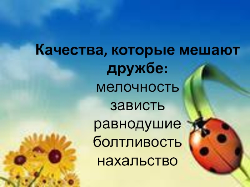 Качества, которые мешают дружбе: мелочность зависть равнодушие болтливость  нахальство