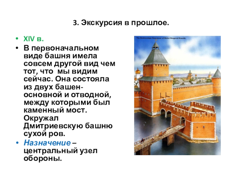 вид чем тот, что мы видим сейчас. Она состояла из двух башен- основной и отводной, между которыми был каменный мост. Окружал Дмитриевскую башню сухой ров.