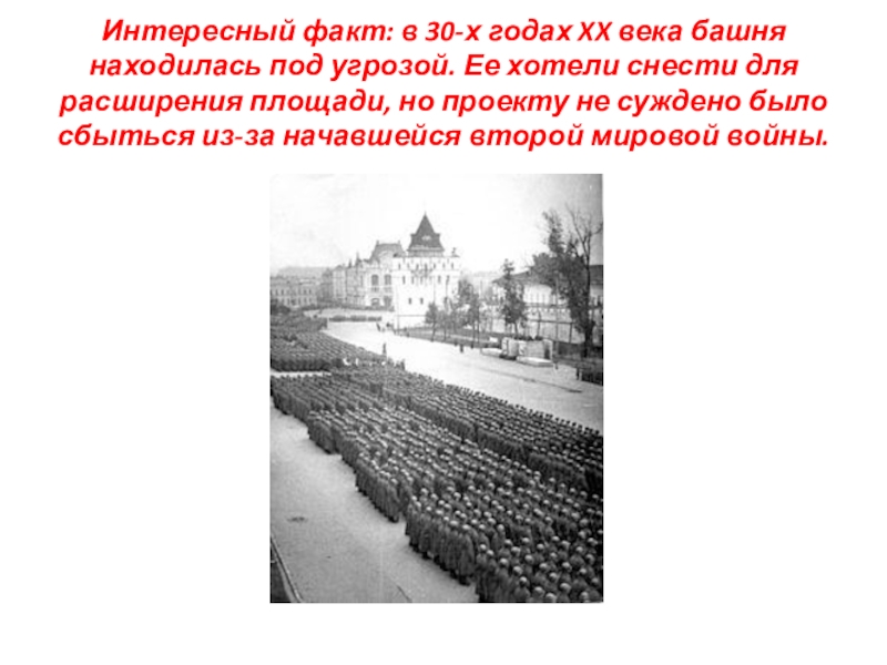 Слайд 11Интересный факт: в 30-х годах XX века башня находилась под угрозой.