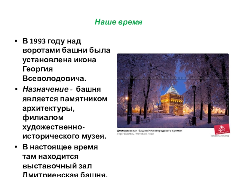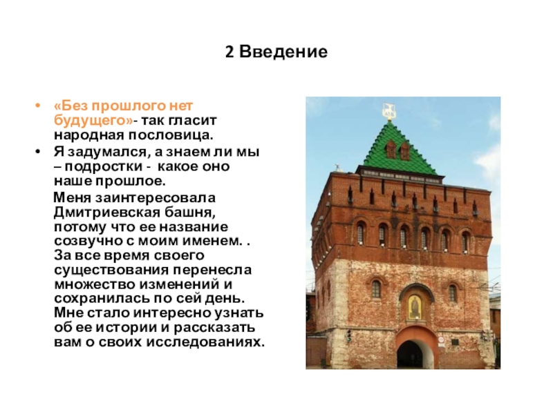 Слайд 1«Без прошлого нет будущего». История Дмитриевской башни Нижегородского кремля»