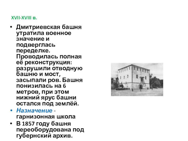 Дмитриевская башня утратила военное значение и подверглась переделке. Проводилась полная