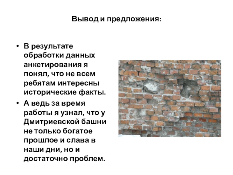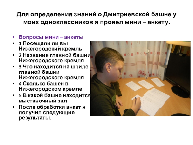Слайд 14Для определения знаний о Дмитриевской башне у моих одноклассников я провел