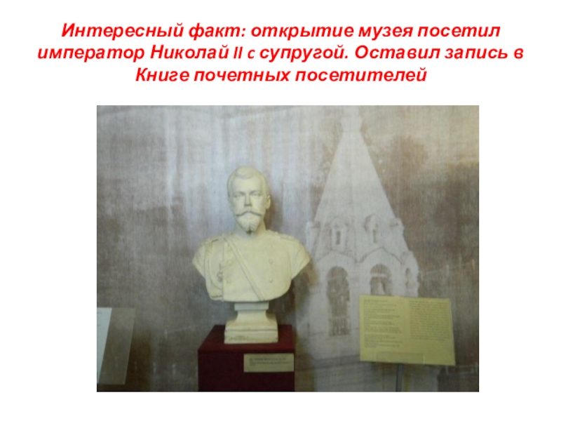Слайд 9Интересный факт: открытие музея посетил император Николай II c супругой. Оставил