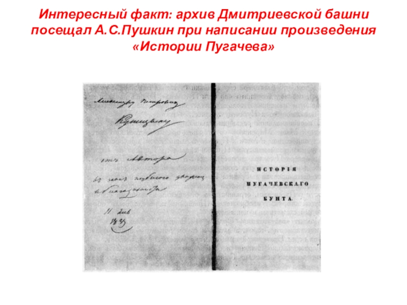 Слайд 7Интересный факт: архив Дмитриевской башни посещал А.С.Пушкин при написании произведения «Истории