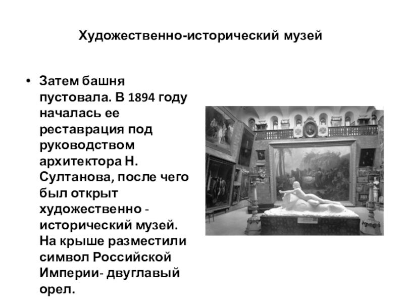 руководством архитектора Н. Султанова, после чего был открыт художественно - исторический музей. На крыше разместили символ Российской Империи- двуглавый орел.