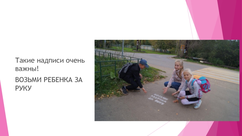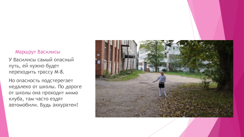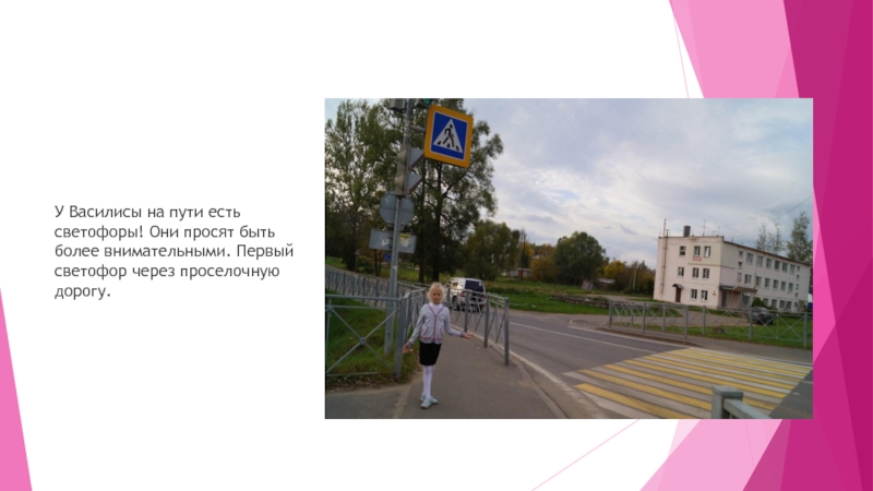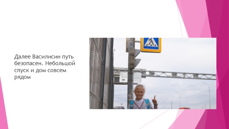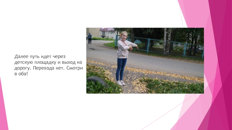Слайд 15Далее путь идет через детскую площадку и выход на дорогу. Перехода