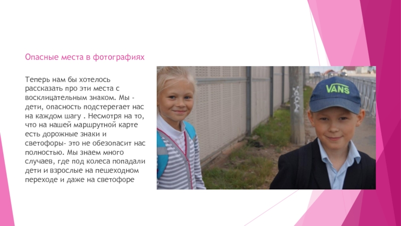 с восклицательным знаком. Мы -дети, опасность подстерегает нас на каждом шагу . Несмотря на то, что на нашей маршрутной карте есть дорожные знаки и светофоры- это не обезопасит нас полностью. Мы знаем много случаев, где под колеса попадали дети и взрослые на пешеходном переходе и даже на светофоре