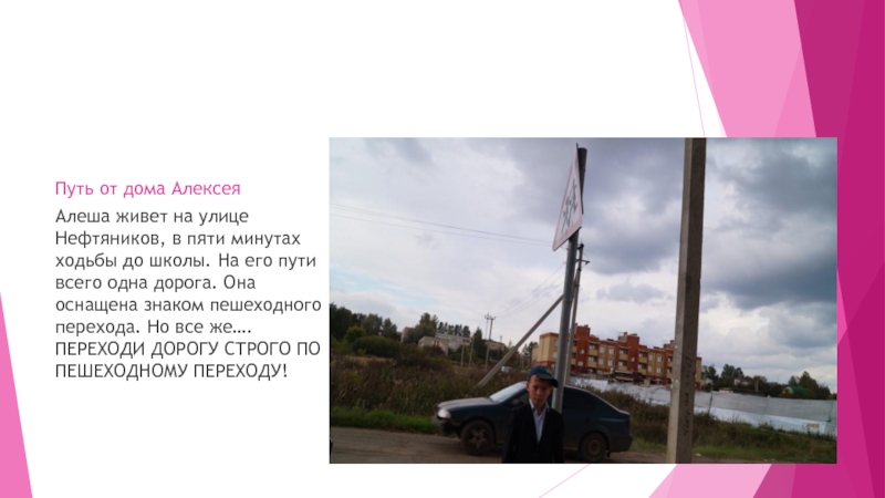 ходьбы до школы. На его пути всего одна дорога. Она оснащена знаком пешеходного перехода. Но все же….ПЕРЕХОДИ ДОРОГУ СТРОГО ПО ПЕШЕХОДНОМУ ПЕРЕХОДУ!