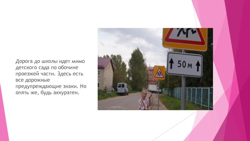 Слайд 16Дорога до школы идет мимо детского сада по обочине проезжей части.