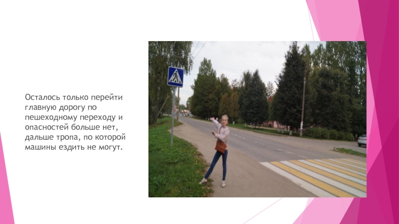 Слайд 19Осталось только перейти главную дорогу по пешеходному переходу и опасностей больше