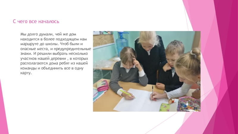 более подходящем нам маршруте до школы. Чтоб были и опасные места, и предупредительные знаки. И решили выбрать несколько участков нашей деревни , в которых располагаются дома ребят из нашей команды и объединить все в одну карту.