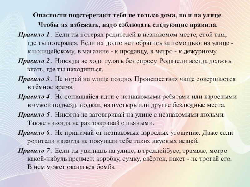 Правило 5 . Никогда не заговаривай на улице с незнакомыми людьми. Также никогда не разговаривай с пьяными.