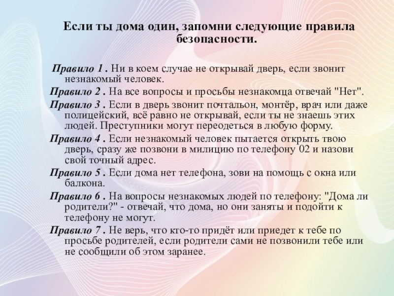 Слайд 6Если ты дома один, запомни следующие правила безопасности.