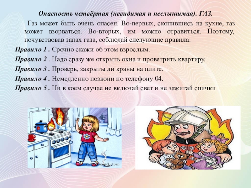 скопившись на кухне, газ может взорваться. Во-вторых, им можно отравиться. Поэтому, почувствовав запах газа, соблюдай следующие правила:
