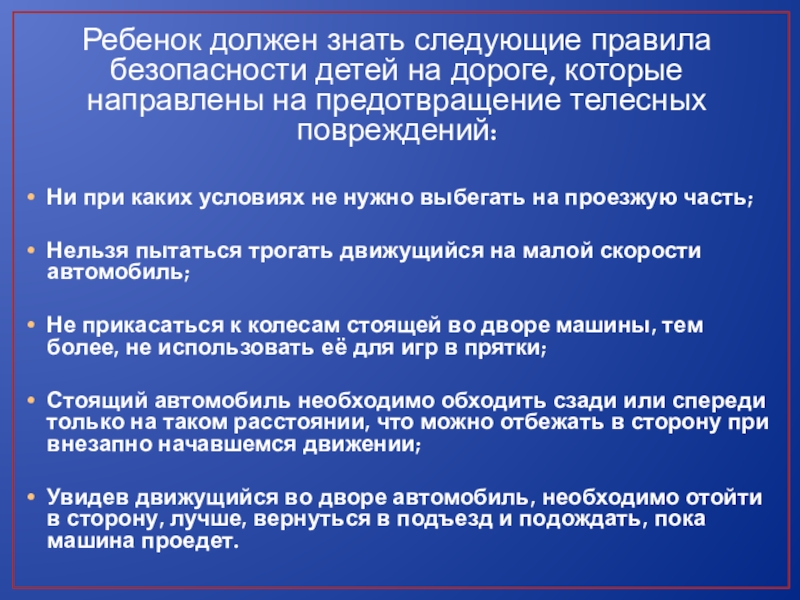 Ребенок должен знать следующие правила безопасности детей на дороге, которые направлены на предотвращение телесных повреждений: Ни при