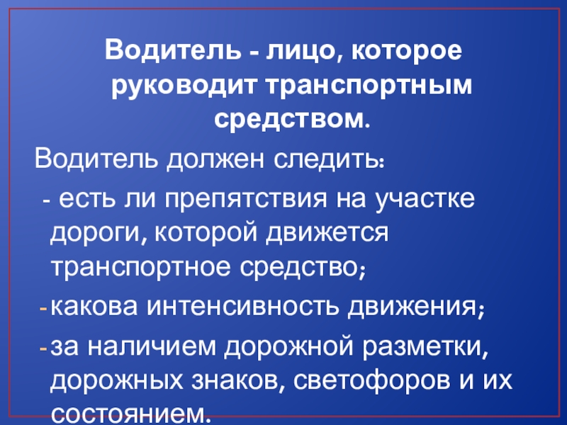 Водитель - лицо, которое руководит транспортным средством. Водитель должен следить: - есть ли препятствия на участке дороги,