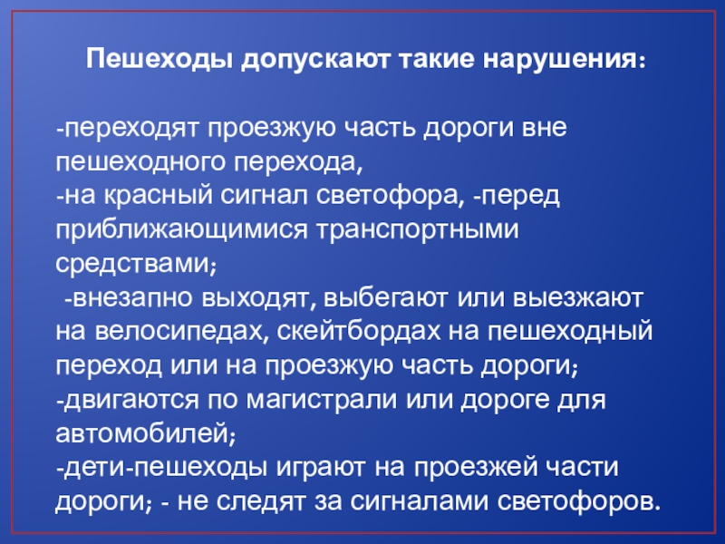 Пешеходы допускают такие нарушения: -переходят проезжую часть дороги вне пешеходного перехода, -на красный сигнал светофора, -перед приближающимися