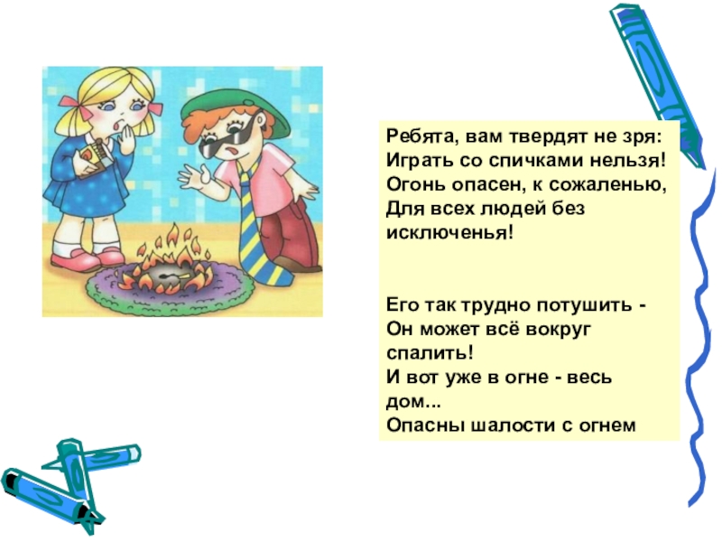 Слайд 5Ребята, вам твердят не зря: Играть со спичками нельзя! Огонь опасен,
