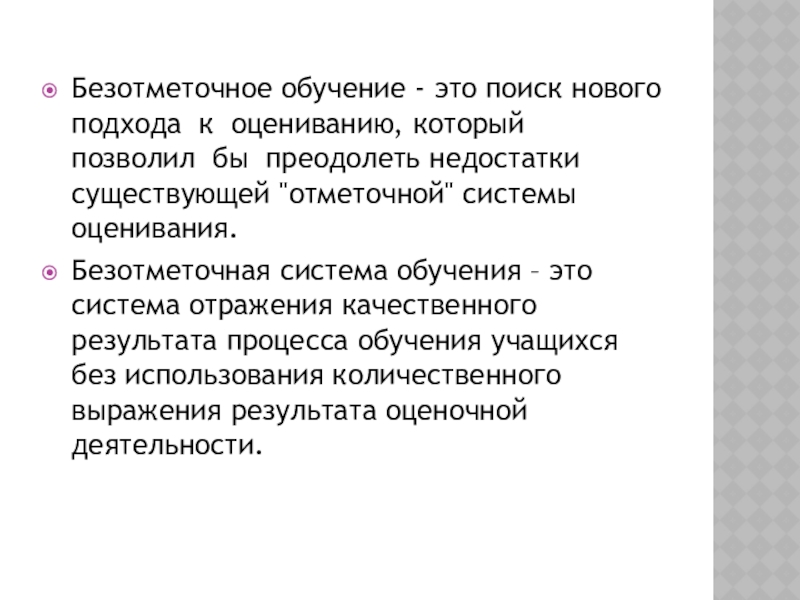 Безотметочная система обучения – это система отражения качественного результата процесса обучения учащихся без использования количественного выражения результата оценочной деятельности.