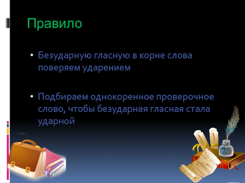 ПравилоБезударную гласную в корне слова поверяем ударениемПодбираем однокоренное проверочное слово, чтобы безударная гласная стала ударной