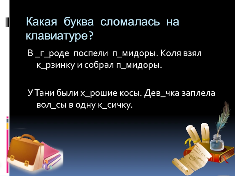 Какая буква сломалась на клавиатуре?В _г_роде поспели п_мидоры. Коля взял к_рзинку и собрал п_мидоры.У Тани были х_рошие