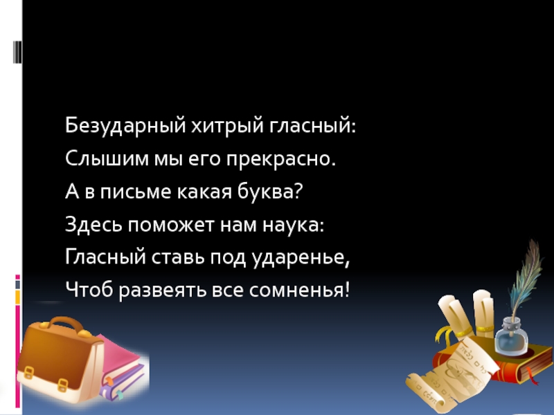 Безударный хитрый гласный:Слышим мы его прекрасно.А в письме какая буква?Здесь поможет нам наука:Гласный ставь под ударенье,Чтоб развеять