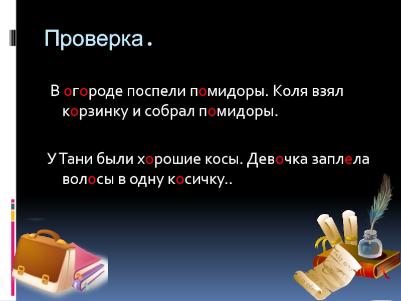 Проверка. В огороде поспели помидоры. Коля взял корзинку и собрал помидоры.У Тани были хорошие косы. Девочка заплела