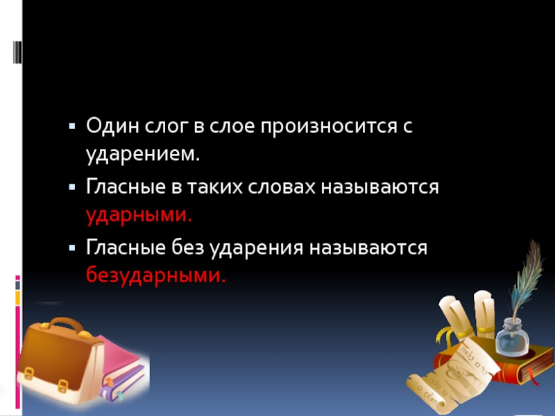 Один слог в слое произносится с ударением.Гласные в таких словах называются ударными.Гласные без ударения называются безударными.