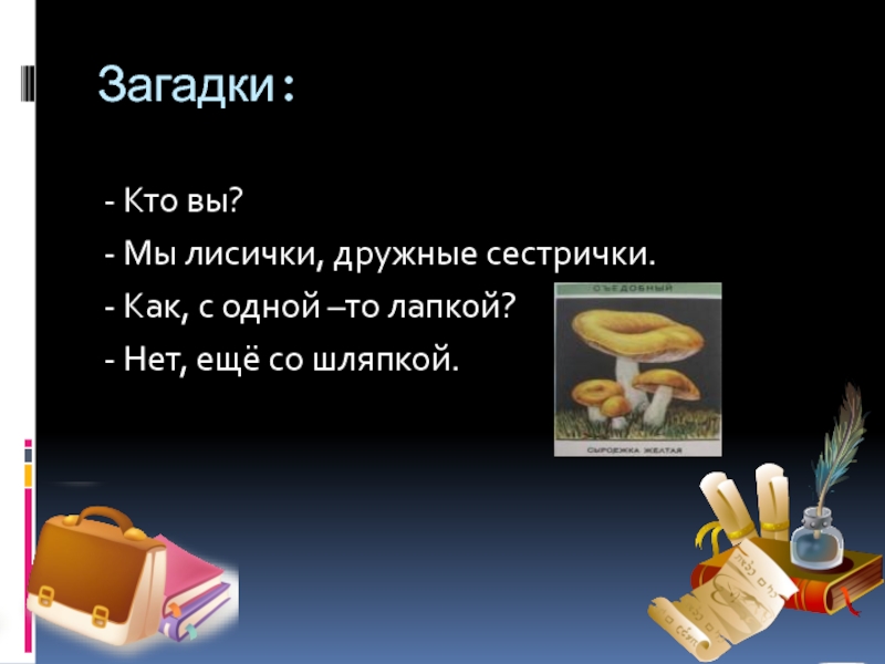 Загадки:- Кто вы?- Мы лисички, дружные сестрички.- Как, с одной –то лапкой?- Нет, ещё со шляпкой.