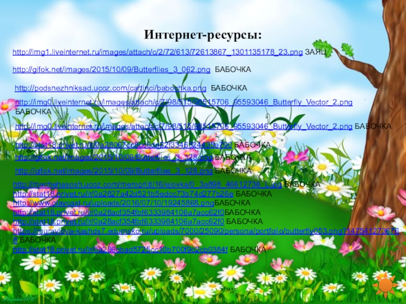 Интернет-ресурсы:http://img1.liveinternet.ru/images/attach/c/2/72/613/72613867_1301135178_23.png ЗАЯЦhttp://gifok.net/images/2015/10/09/Butterflies_3_062.png БАБОЧКАhttp://podsnezhniksad.ucoz.com/cartinci/babochka.png БАБОЧКАhttp://img0.liveinternet.ru/images/attach/c/7/98/515/98515706_95593046_Butterfly_Vector_2.png БАБОЧКАhttp://img0.liveinternet.ru/images/attach/c/7/98/515/98515706_95593046_Butterfly_Vector_2.png БАБОЧКАhttp://stat18.privet.ru/lr/0a28067cc8cc6da22f3346324435e790 БАБОЧКАhttp://gifok.net/images/2015/10/09/Butterflies_3_128.png БАБОЧКАhttp://gifok.net/images/2015/10/09/Butterflies_3_128.png БАБОЧКАhttp://machehasosh.ucoz.com/meroprijtij16/ejovka/0_3a898_46612736_L.jpg БАБОЧКАhttp://stat18.privet.ru/lr/0a2827a42d521b5edcc73b74d277b26e БАБОЧКАhttp://www.playcast.ru/uploads/2016/07/10/19245868.pngБАБОЧКАhttp://stat18.privet.ru/lr/0a28acf354fbf6333984106a7acc62f0БАБОЧКАhttp://stat18.privet.ru/lr/0a28acf354fbf6333984106a7acc62f0 БАБОЧКАhttps://muraviova-kashds7.edumsko.ru/uploads/7000/25090/persona/portfolio/butterfly053.png?1475412736768 БАБОЧКАhttp://stat18.privet.ru/lr/0a286cbad5725cc10b700f9c2cb0384f БАБОЧКА