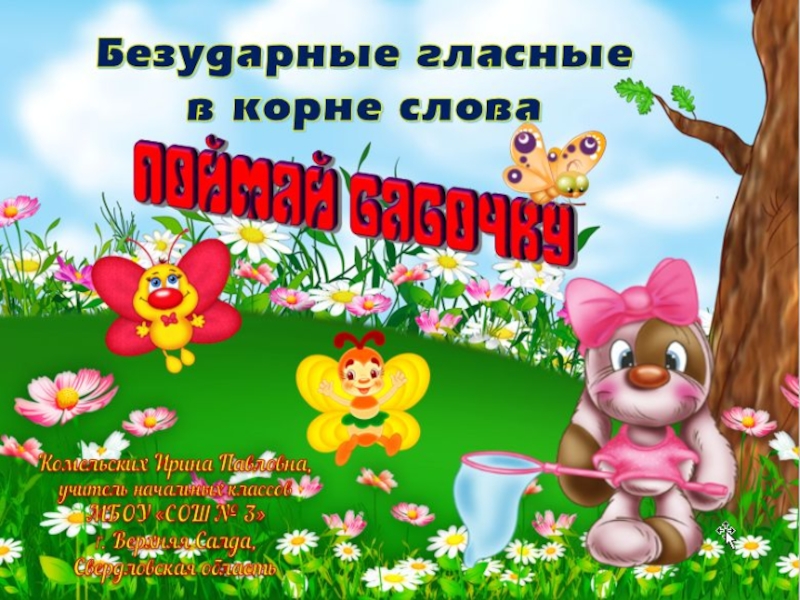 Презентация, доклад на тему Безударные гласные в корне слова. Тренажер по русскому языку Поймай бабочку