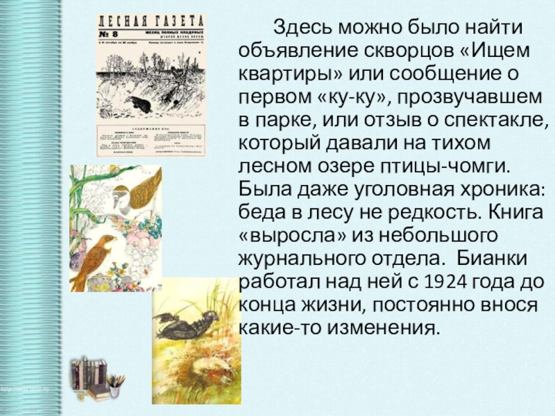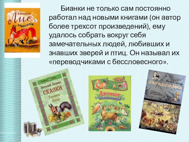 Слайд 11 Бианки не только сам постоянно работал над новыми книгами (он автор