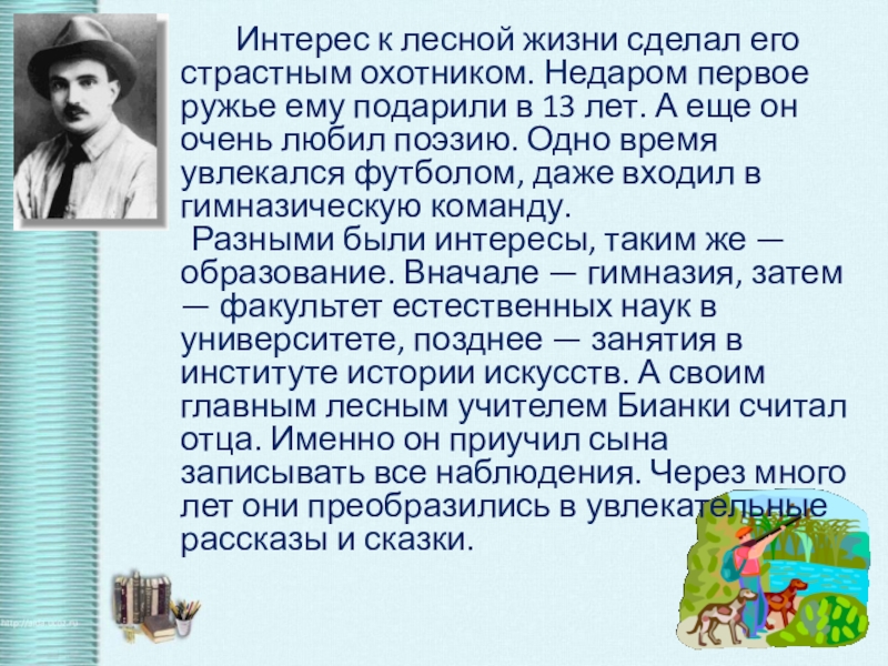 Слайд 5 Интерес к лесной жизни сделал его страстным охотником. Недаром первое ружье