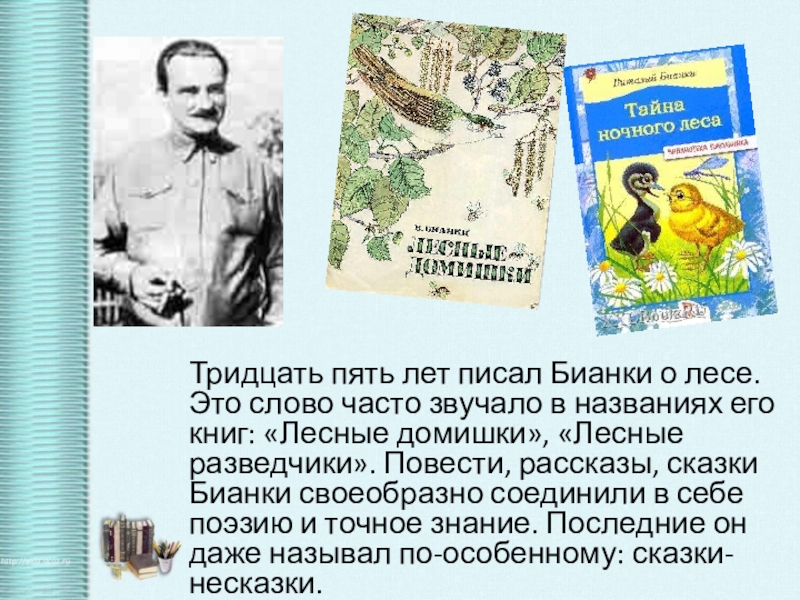Слайд 13Тридцать пять лет писал Бианки о лесе. Это слово часто звучало